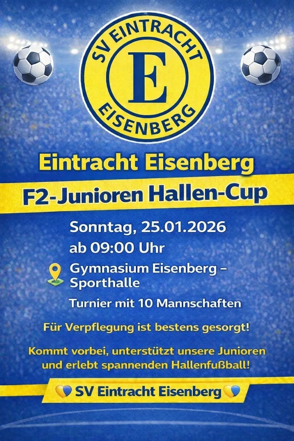 Eisenberg: Bürgermeister Kieslich eröffnet am Sonntag, 09:00 Uhr das Hallenturnier der F2- Jugend in der Sporthalle des Friedrich-Schiller-Gymnasium Eisenberg. Mit 10 Mannschaft hat das Turnier eine gute Besetzung gefunden und den guten Ruf der Eintracht bestätigt.