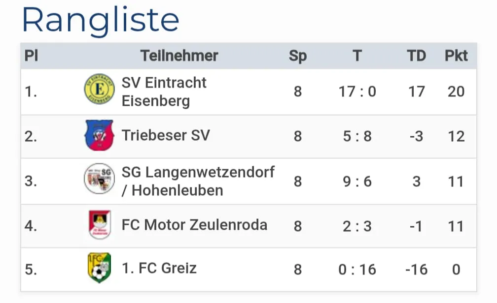 SV Eintracht vs Zeulenroda 0:0 / 0:0, - Triebes 3:0 / 4:0, - Greiz 3:0 / 3:0, - Langenwetzendorf 1:0 / 3:0